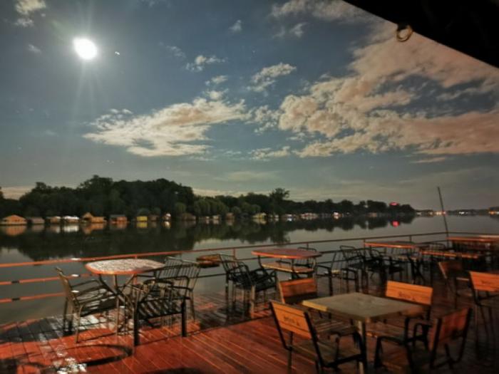 Objekat poseduje 350 m2 + 360 m2 terase, pravljen na pontonima. Zauzima 63 m obale.