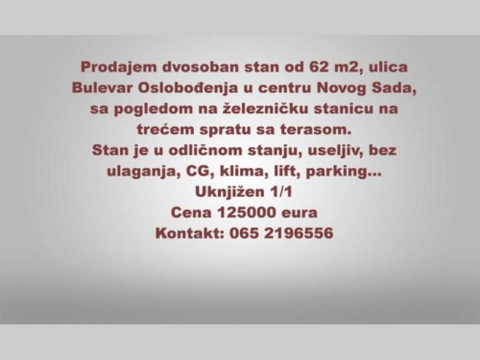 Prodajem dvosoban stan od 62 m2, ulica Bulevar Oslobođenja u centru Novog Sada, sa pogledom na železničku stanicu na trećem spratu sa terasom.