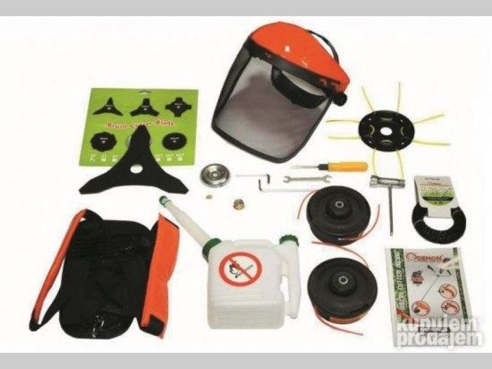 - Trokraki nož - Auto-cut - najlon glava za travu i to dva komada - Metalni disk za strunu, - Uprtac - prsluk za kacenje trimera na oba ramena - Profi vizir, kanister za mesavinu - Alat za sklapanje i održavanje