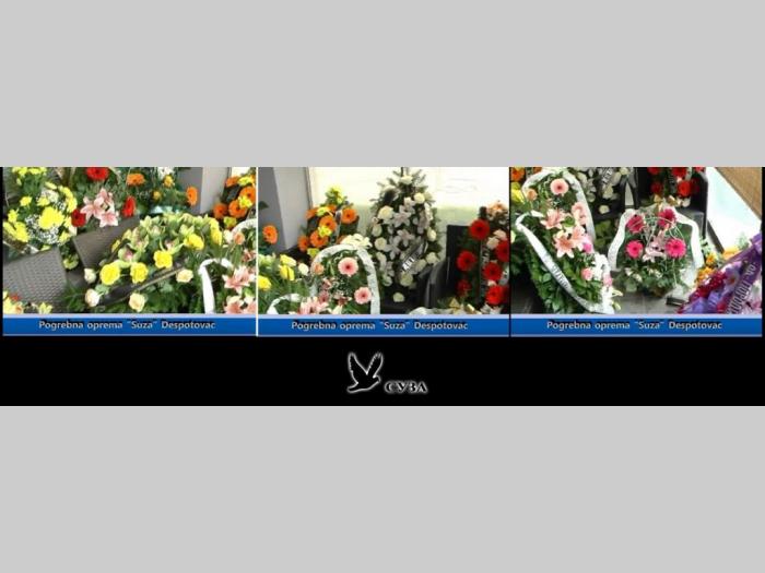 Pogrebna oprema Suza. Nalazimo se u Despotovcu, u Ulici Despota Stefana Lazarevića 122 i nudimo sve vrste pogrebnih usluga,od prodaje opreme, transporta preminulih,štampanja posmrtnica i svega ostalog što može olakšati porodici nemili događaj: po pozivu dolazimo na adresu, prodaja kompletne pogrebne opreme vrhunskog kvaliteta i dizajna po najpovoljnijim cenama u gradu, prevoz pokojnika u zemlji i inostranstvu, obezbeđujemo muziku, štampamo posmrtnice sa slikom i tekstom po želji, crnina,peškiri,žalbene trake, venci od prirodnog,svilenog i veštačkog cveća, buketi za krst, suze Po dogovoru odloženo plaćanje,refundiramo novac od fonda, priznajemo sva humanitarna društva,saradnja sa firmama. Besplatan prevoz pokojnika do 50km.