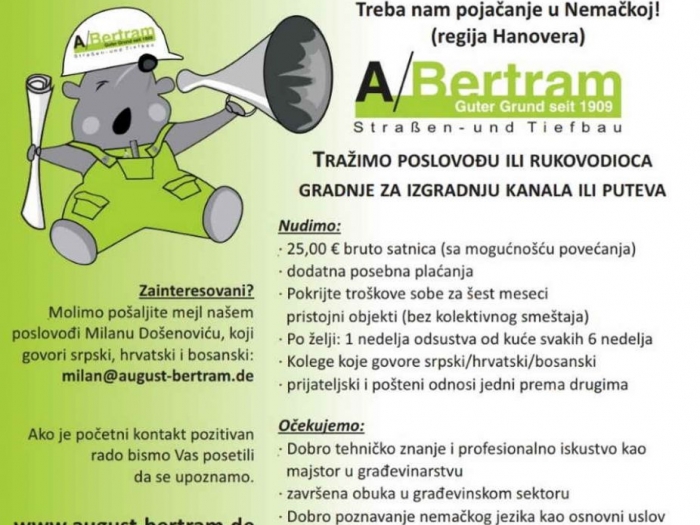 Tražimo poslovođu ili rukovodioca – HANOVER Gradnje za izgradnju kanala ili puteva. Nudimo dobre uslove. Potrebno profesionalno iskustvo majstora u gradjevinarstvu, dobro poznavanje nemačkog jezika, kao osnovni uslov. Kontakt isključivo slati poslovođi Milanu Došenoviću. Naš vebsajt: www.august-bertram.de