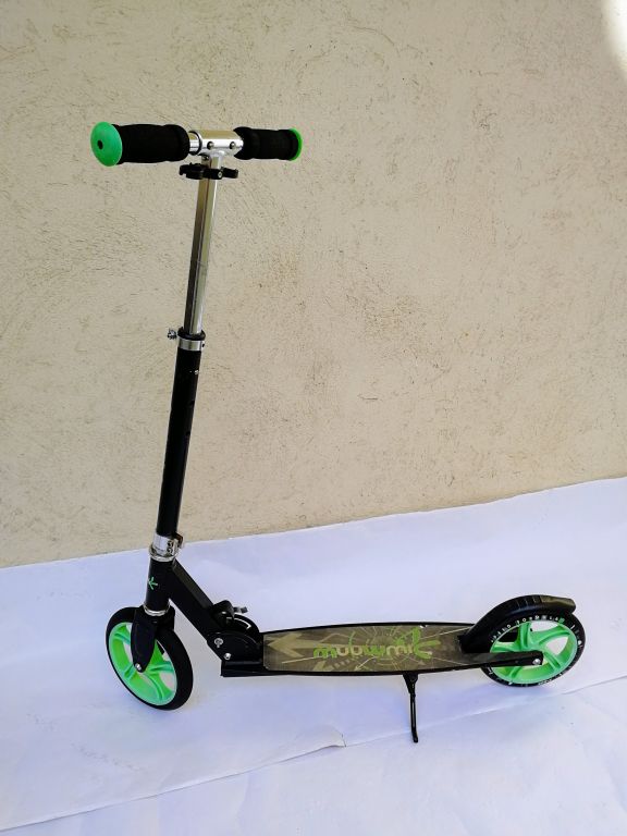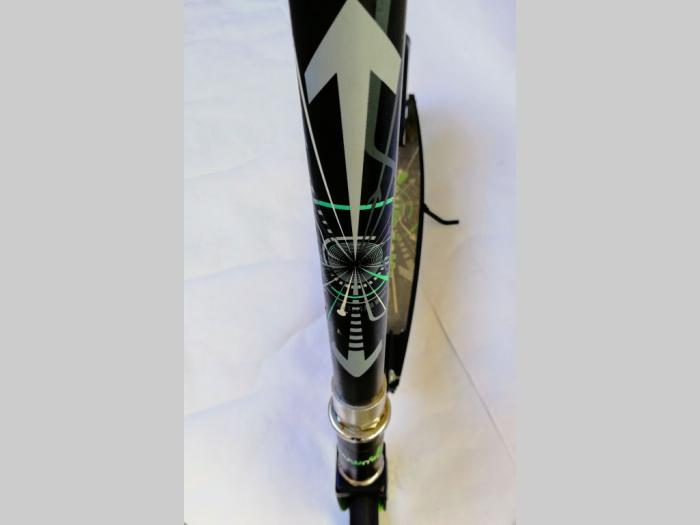 Veoma očuvan - ni nalepnica na gazištu se nije pohabala, aluminijumski ram.Točkovi su prečnika 20cm. Visina rukohvata je do 104 cm. Na odličan sistem pričvršćivanja zglobnog dela tako da neostavlja luft i vožnju čini bezbednom.
