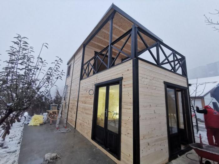 Stambeni kontejner KN 20 – ravna daska 2cm sa spoljnje strane + vuna 5cm + lamperija 1,4cm sa unutrašnje strane. Soba u prizemlju 6,5 x 3m i kupatilo 1,5 x 3m. Sprat soba 4m x 3m + terasa 4 x 3m. Cena 8760 evra sa olucima i prostorijama. Objekat se kompletno izrađuje od drveta. Ako želite metalnu konstrukciju, to je vaša obaveza, betonska ploča takođe. Navedena cena se odnosi na sivu fazu - bez struje i vode.
