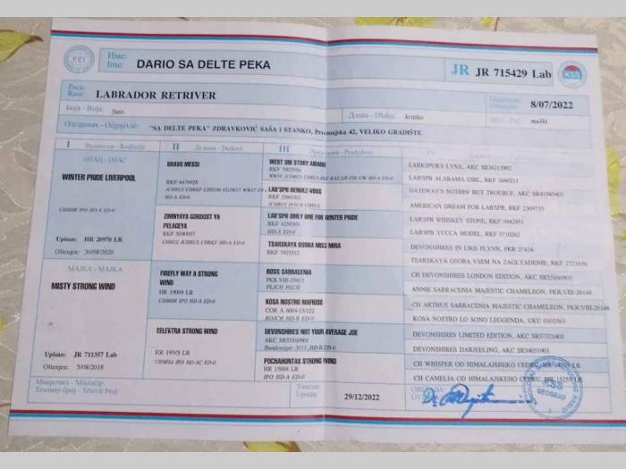 Mužjak labrador retriver star 13 meseci, kompletnog i pravilnog zubala, čipovan, ocenjen, sa svom dokumentacijom, odličnog porekla, deda od mužjaka je Bravo Messi Internationač Champion, World Winner, Vice Word Winner, Junior European Winner - prodaje se zbog nemogućnosti držanja.