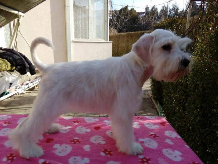 Patuljasti beli šnaucer, žensko štene vrhunskog kvaliteta,staro 4 meseca, pravi izložbeni primerak na prodaju. Odlične anatomije, pravilno uglovano, oštre dlake, odličnog karaktera na prodaju. Cena povoljna.