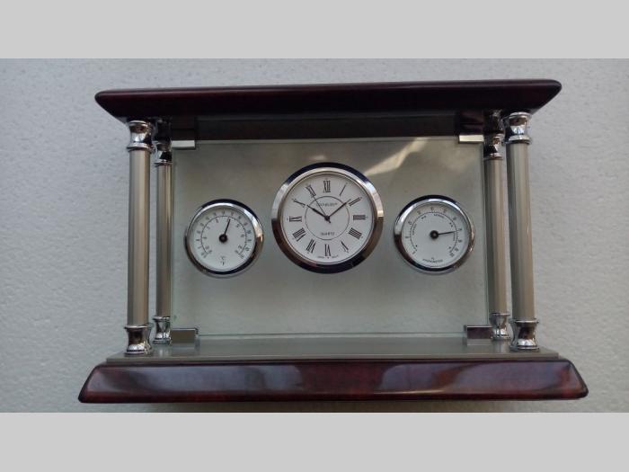 Na prodaju Danbury stoni sat nov, luksuzne izrade drvo, metal, staklo sa kvarcnim satom japanske proizvodnje, termometrom i hidrometrom za merenje vlažnosti vazduha.