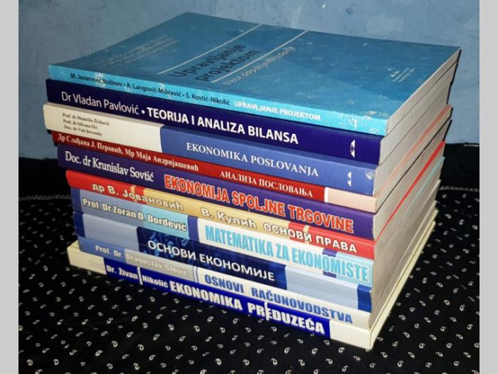 Ekononske knjige, cena po knjizi je 500 dinara: 1. Osnovi ekonomije - Igor Pejović 2. Osnovi prava - dr Vladimir Jovanović i Vuk Kulić dipl. pravnik 3. Osnovi računovodstva - dr Dragoslav Slović 4. Ekonomija spoljne trgovine - Doc. dr Krunislav Sovtić 5. Knjigovodstvo - Radovan Brkljac 6. Matematika za ekonomiste - Prof. Dr Zoran D. Đorđević 7. Ekonomika preduzeća - Prof. Dr Zivan Nikolic 8. Ekonomika poslovanja - Prof. dr Momčilo Živković 9. Teorija i analiza bilansa - Dr Vladan Pavlović 10. Analiza poslovanja - Dr Slađana J. Perović 11. Open Office. org 3 - obrada teksta i tabelarni proračuni (oštecena malo) 12. Zbirka zadataka iz matematike - za više obrazovanje radnika (polovna) 13. Knjigovodstvo - sa pravilnikom o organizaciji računovodstva i vođenju, 700 dinara
