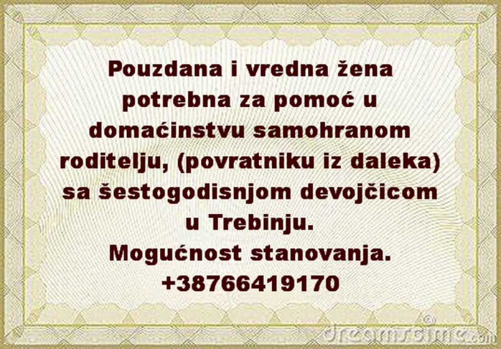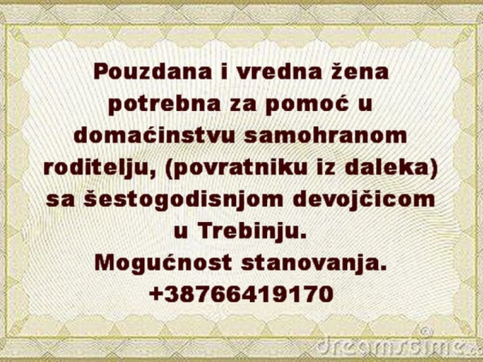 Pouzdana i vredna žena potrebna za pomoć u domaćinstvu samohranom roditelju (povratniku iz daleka) sa šestogodisnjom devojčicom u Trebinju. Mogućnost stanovanja.