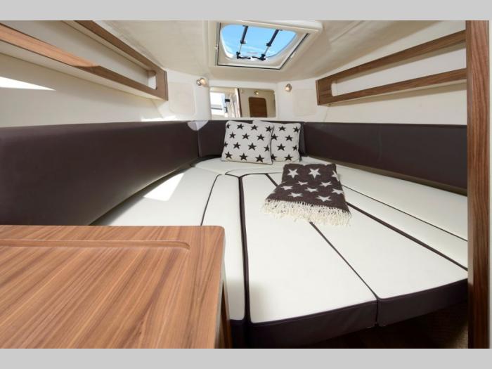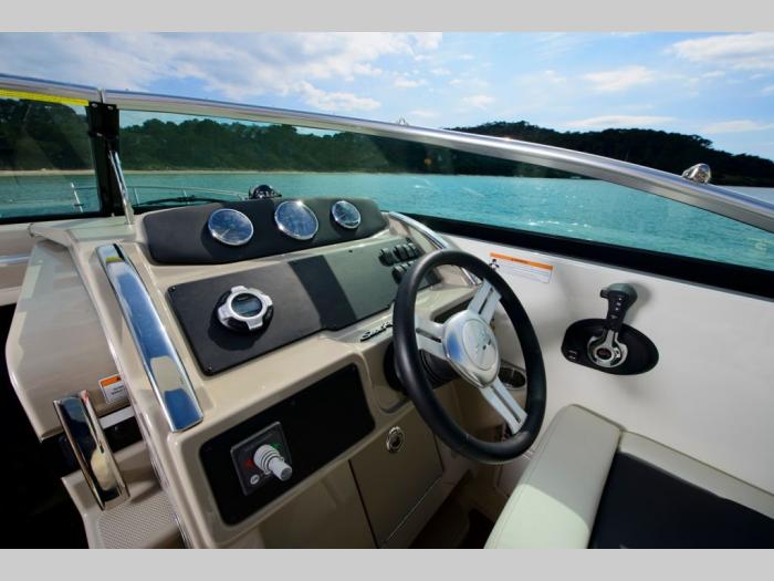 Standardna oprema: 12V Outlet CD Player AM/FM stereo uređaj i 4 vodootporna zvučnika Automatska kaljužna pumpa u motornom prostoru Podesiv upravljački volan Sirena Komplet instrumenata u kontrolnoj tabli (pokazivač nivoa goriva, pritisak ulja, brzinomer, obrtomer indikacija trima noge, temperatura, voltmetar) Navigaciona svetla Produžena krmena platforma Sklopive prohromske merdevine na krmi za plivača Kuka za privez skijaša Vozačevo i suvozačevo sedište - okretne kadice sa podizajućim jastucima Krmena klupa sa ležaljkom za sunčanje Automatski sistem za gašenje požara u motornom prostoru Tapacirung - Sand Drvo u enterijeru - orah Hidraulični trim tabovi Docking lights - Svetla pristajanja Elektricno vitlo na pramcu sa prohromskim sidrom, lancem, kanapom i daljinskom komandom Bimini top tenda sa futrolom i vertikalnim spremištem Canvas paket, cirade Cirada prekrivac kokpita Tepih sa drikerima u kokpitu Sto od tikovine u kokpitu,podesivi Tuš u kokpitu Mala kabinska kuhinja "Corian" sa umivaonikom, frižiderom i radnom površinom Šporet u kabini Električni toalet sa tankom za otpadne vode i Macerator-om Punjač akumulatora Struja 220V / 50Hz el. sistem Paket za lučko napajanje strujom sa konverterom i kablom - 220V / 50Hz